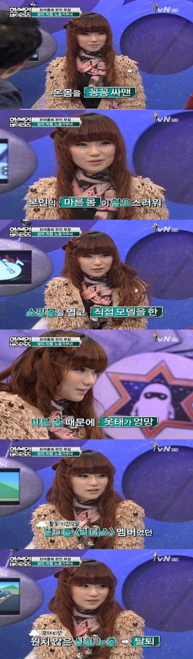 특히 노출거부녀는 "사실 나는 24인조 걸그룹 리더스 멤버로서 활동했다. 하지만 노출이 심한 옷이 많아서 이마저도 포기했다"고 밝혀 MC들을 놀라게 했다.