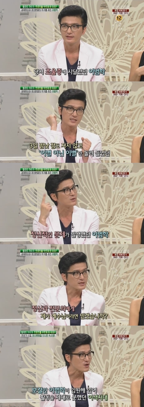 이어 이범학은 "첫방송 하기 위해 외출증을 끊어 나왔다. 과대 망상으로 폐쇄 병동에 들어갔다. 조울증이 정말 심했다. 들어갈 땐 예수님이었는데 나오니까 미미한 존재더라"고 덧붙였다.