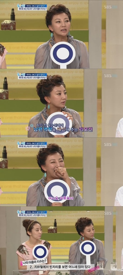 설수진은 "나는 리모컨을 붙잡고 잠든 적 있다"는 질문에 O를 들어 눈길을 끌었다. 설수진은 MC들이 놀라자 "남편과 내가 따로 잠을 자기 때문에 TV를 항상 틀어놓고 있다"고 밝혔다.