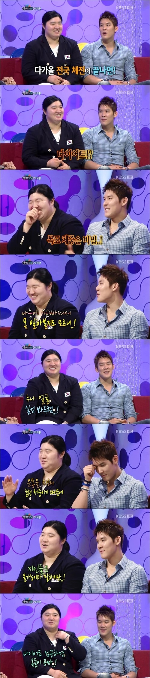 박태환은 "장미란이 곧 있을 전국체전 일정이 끝나면 다이어트를 하겠다더라"며 "자기 체중보다 굉장히 많이 빼겠다고 말했다"고 밝혔다.