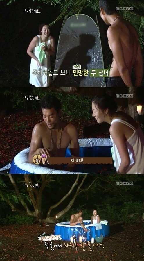 이어 작은 튜브식 욕조와 샴푸, 와인 등을 준비했다. 하지만 폭우가 내리기 시작했고 빗줄기는 점점 굵어져서 급기야 촬영까지 중단되고 말았다. 욕조 속에 들어가 있던 둘은 민망함을 감추지 못했지만 잊지 못할 추억을 남기며 즐거워 하는 모습이었다.